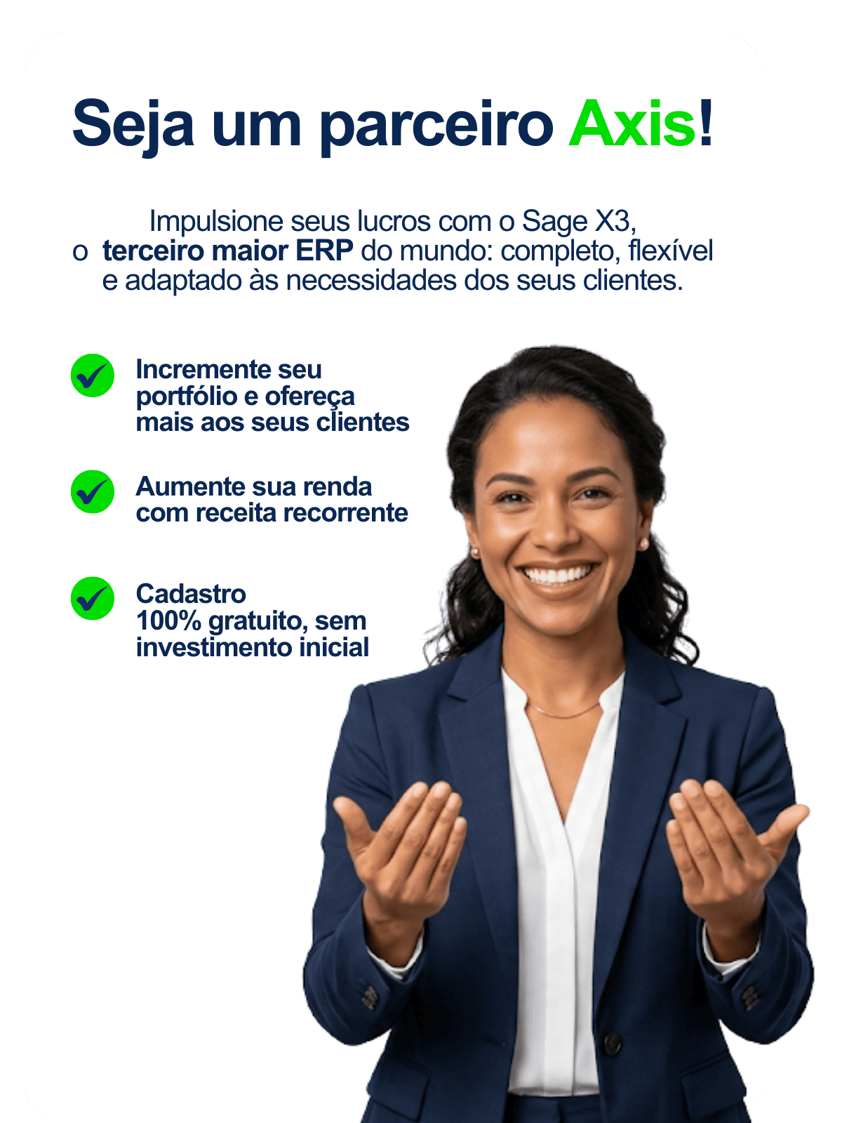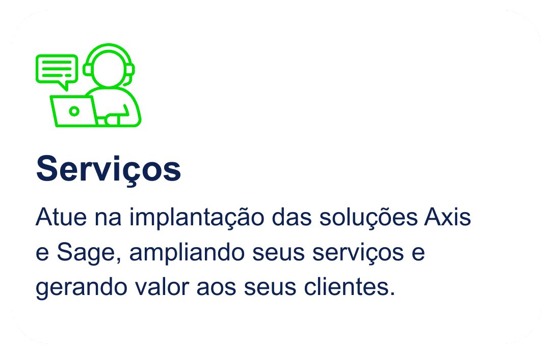 Como parte do Programa de Canais Axis, você poderá atuar com venda direta, projetos de implantação ou apenas com indicação qualificada, sempre com apoio próximo e direcionado. Escolha o formato que mais se adeque ao seu modelo de negócios e passe a contar